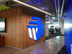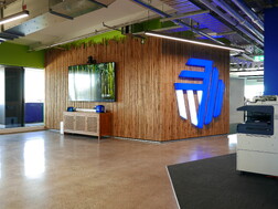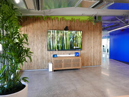 vertical canes curve around the reception desk, the corridor is lined with similar screens